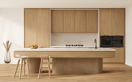 - Обработка: Фасады делают максимально простыми, гладкими или с минималистичной фрезеровкой. Дерево часто покрывают прозрачным матовым лаком на водной основе, маслом или воском, чтобы сохранить тактильное ощущение натуральной древесины. Очень популярно выбеливание дерева, при котором сквозь полупрозрачную белую или светло-серую краску проступает природная фактура.